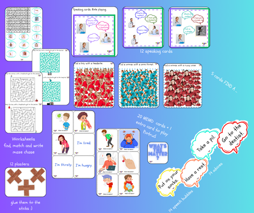 Kilka worksheets (wykreślanka - znajdź, wykreśl i napisz- więc jest o wiele bardziej angażująca niż inne wykreślanki) oraz 6 labityntów np. “Help the woman with a backache get to the hospital”
