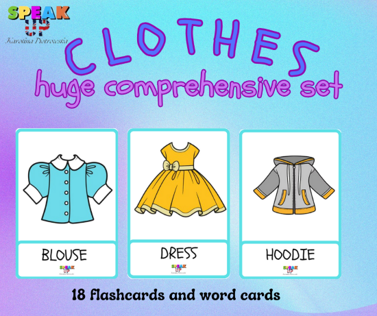 👚 18 flashcards z word cards ze wszystkimi grupami ubrań występujących w tym secie: blouse, shirt, jacket, T-shirt, shorts, shoes, boots, socks, jeans, trousers, dress, cardigan, skirt, vest, hat, jumper, longsleeve i hoodie)