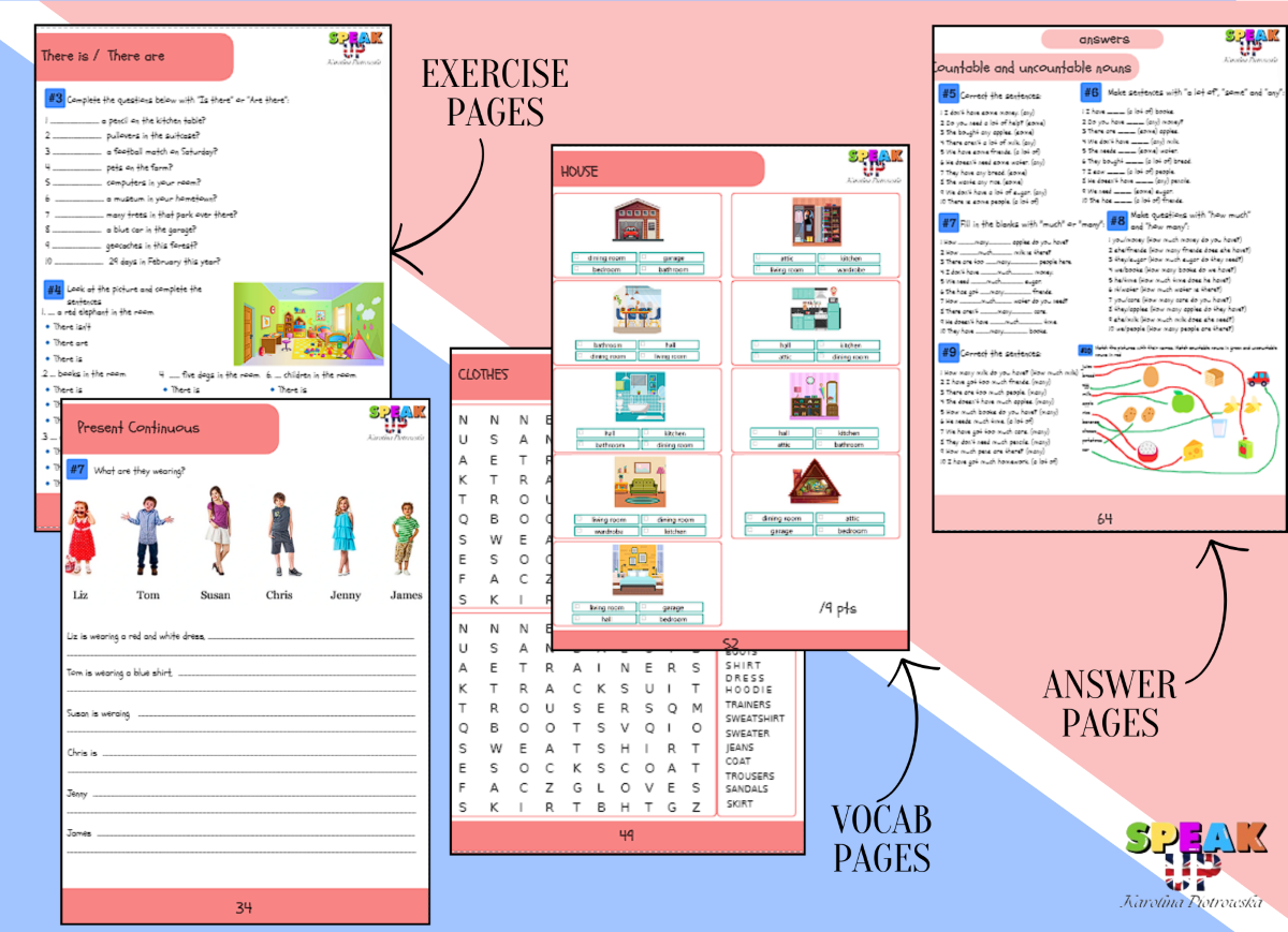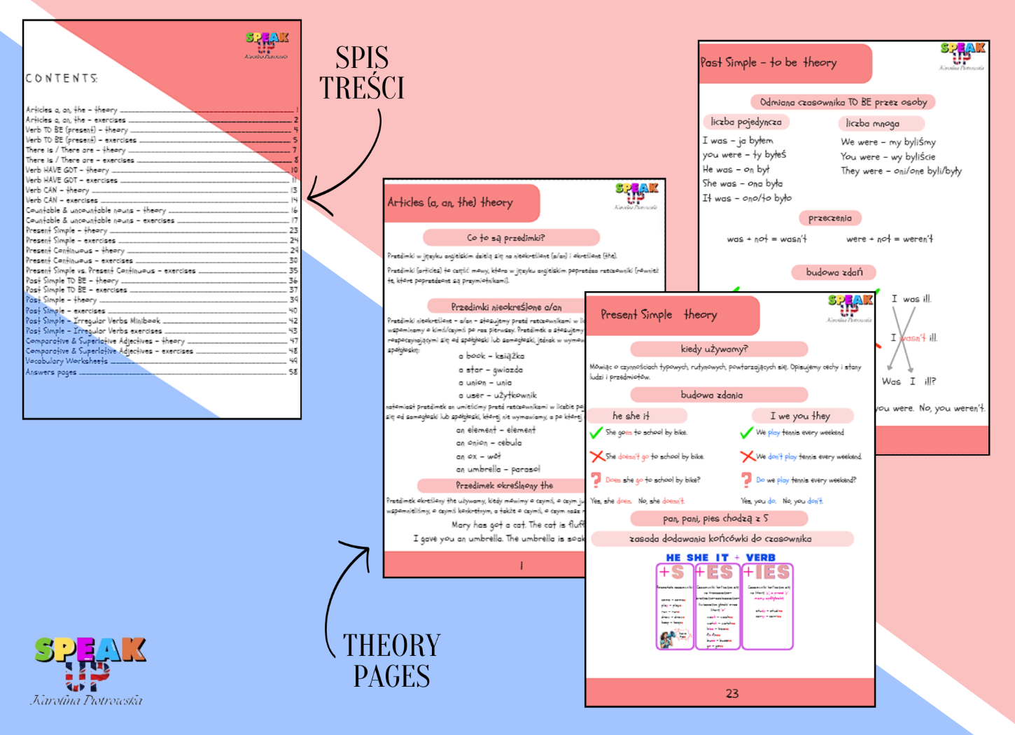 𝗦𝗽𝗶𝘀 𝘁𝗿𝗲ś𝗰𝗶: 🔹articles a, an, the 🔹 verb TO BE (present) 🔹There is / There are 🔹verb HAVE GOT 🔹verb CAN 🔹Countable & uncountable nouns (some, any, a lot of, much, many, how much, how many 🔹Present Simple 🔹Present Continuous 🔹Present Simple vs. Present Continuous 🔹Past Simple TO BE 🔹Past Simple 🔹Past Simple - Irregular Verbs Minibook 🔹Comparative & Superlative Adjectives 🔹Vocabulary Worksheets 🔹Answer pages