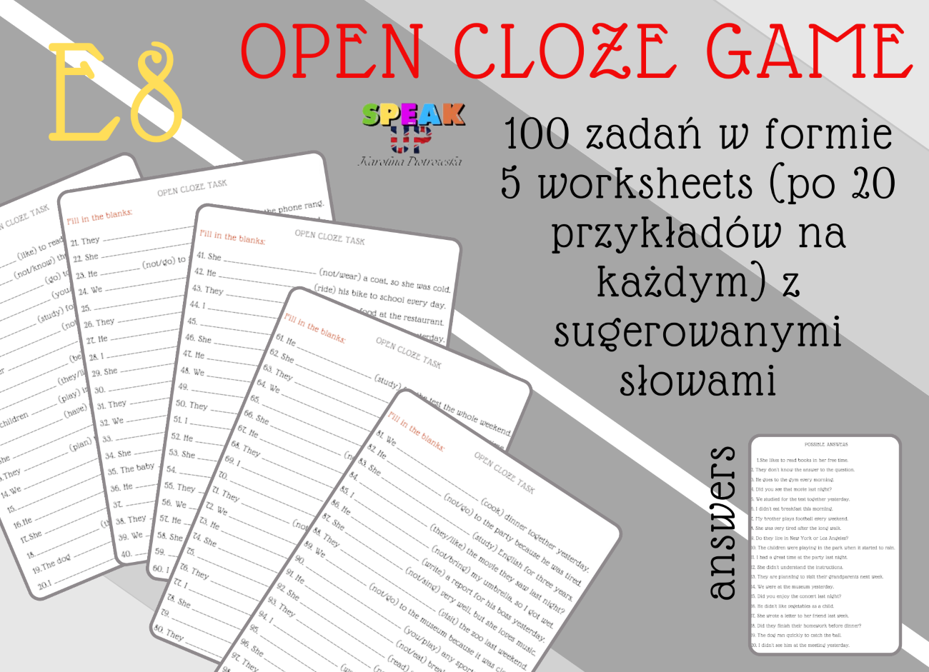 Oprócz kart, w zestawie znajdziesz także 5 worksheets (po 20 przykładów na każdym), gdzie słowa sugerowane już się znajdują 😊