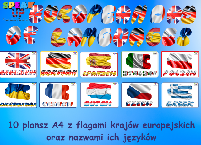 🔷 duży napis EUROPEAN DAY OF LANGUAGES - każda litera to rownież flaga europejskiego kraju i mieści się na karcie w formacie A4