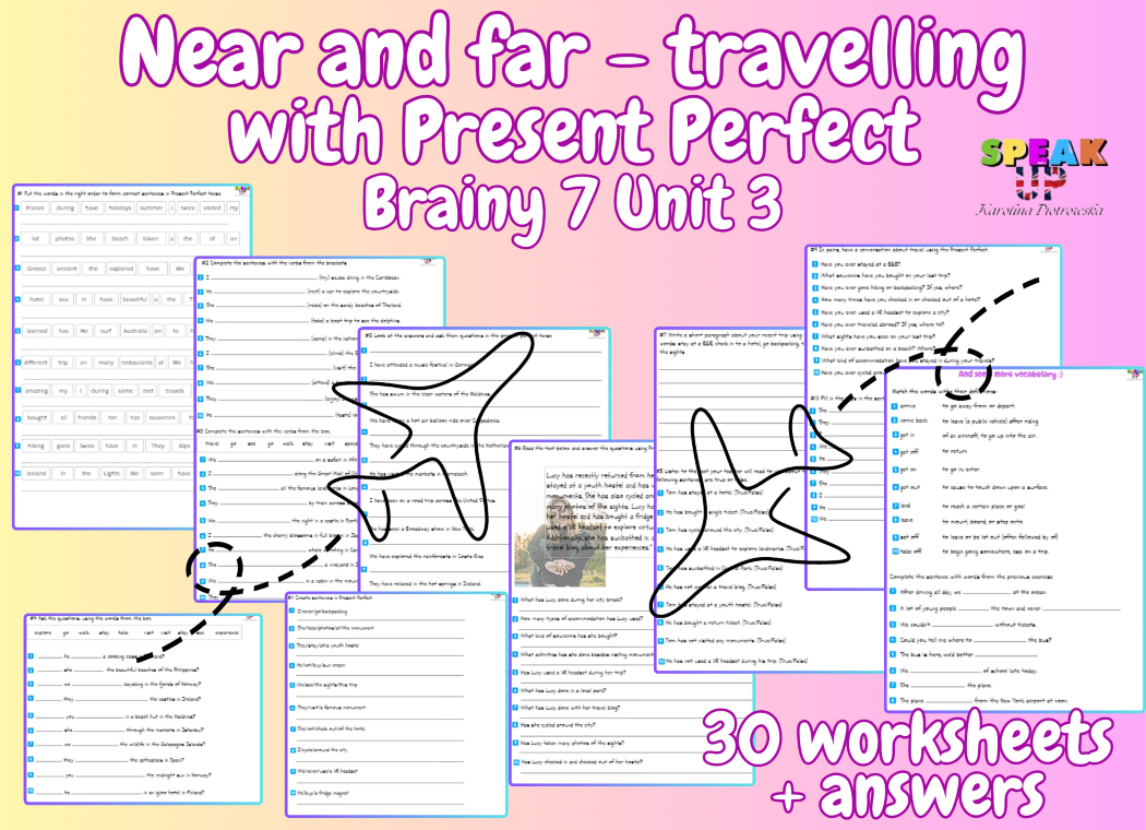 ✈️aż 𝟭𝟯 worksheets (vocab + grammar), co daje 𝟭𝟭𝟴 przykładów, a wśród nich m.in. 𝘄𝗿𝗶𝘁𝗶𝗻𝗴, 𝘀𝗽𝗲𝗮𝗸𝗶𝗻𝗴 i 𝗹𝗶𝘀𝘁𝗲𝗻𝗶𝗻𝗴