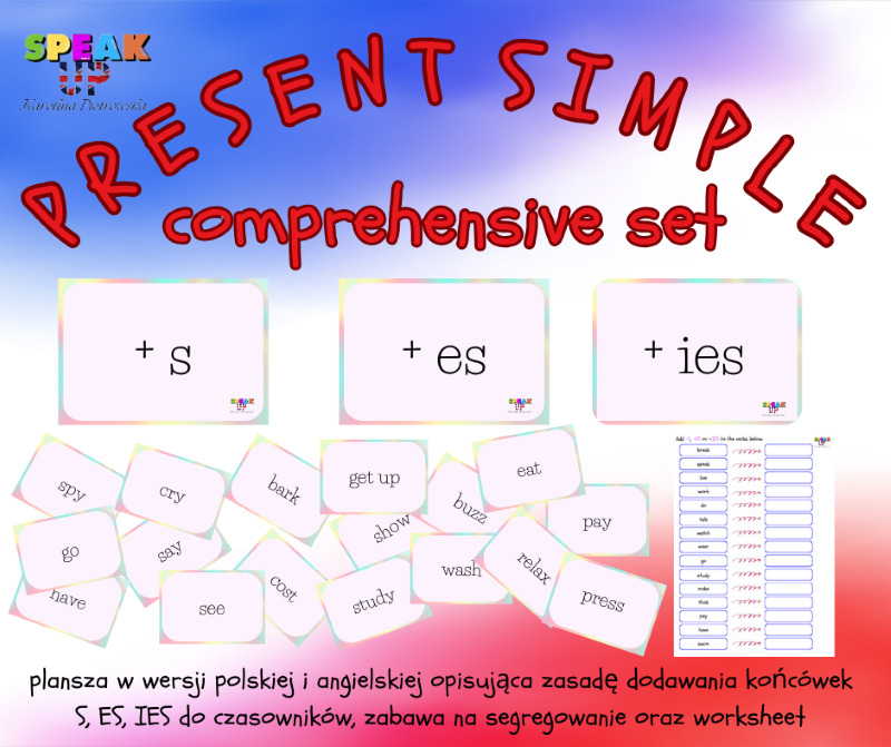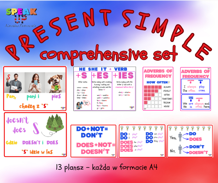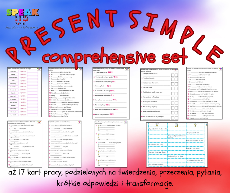 Ten zestaw to niejako przewodnik po Present Simple. Idąc materiałami po kolei, przeprowadzisz swoich uczniów przez niego bez wysiłku - Twojego i Twoich uczniów.