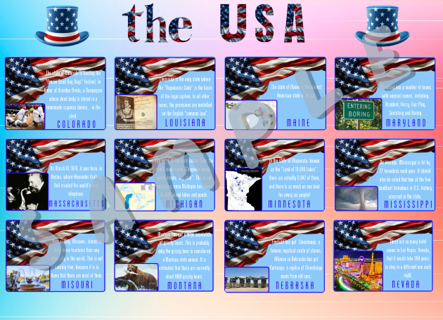 Estetycznie wykonana, zawierająca ciekawostki o 𝘄𝘀𝘇𝘆𝘀𝘁𝗸𝗶𝗰𝗵 𝘀𝘁𝗮𝗻𝗮𝗰𝗵 𝘄 𝗨𝗦𝗔 gazetka ścienna, która moze wisieć cały rok 😊